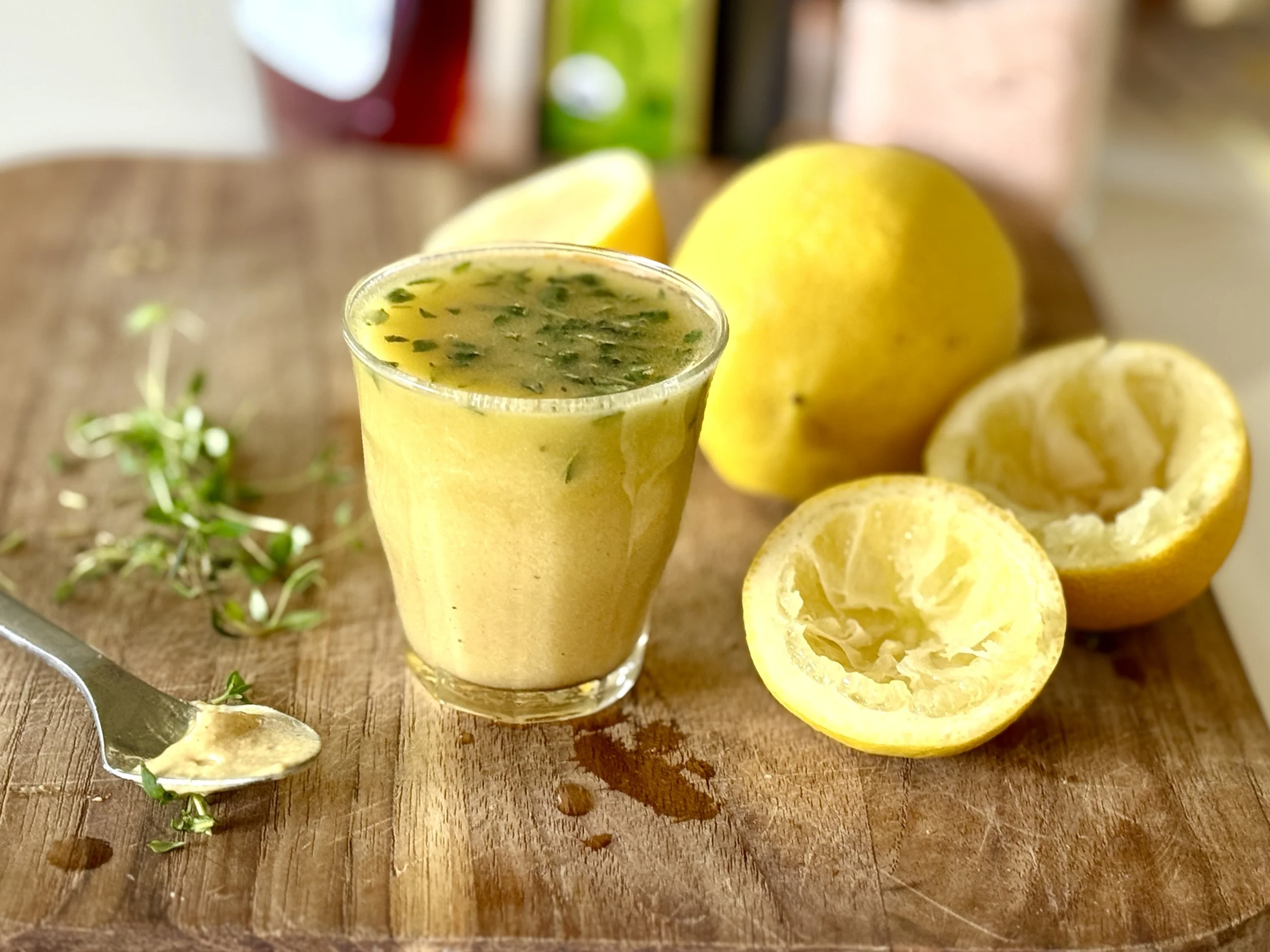 Tart and bright lemon juice paired with a touch of maple syrup and your favorite aromatics make for a delightfully easy and bright dressing.