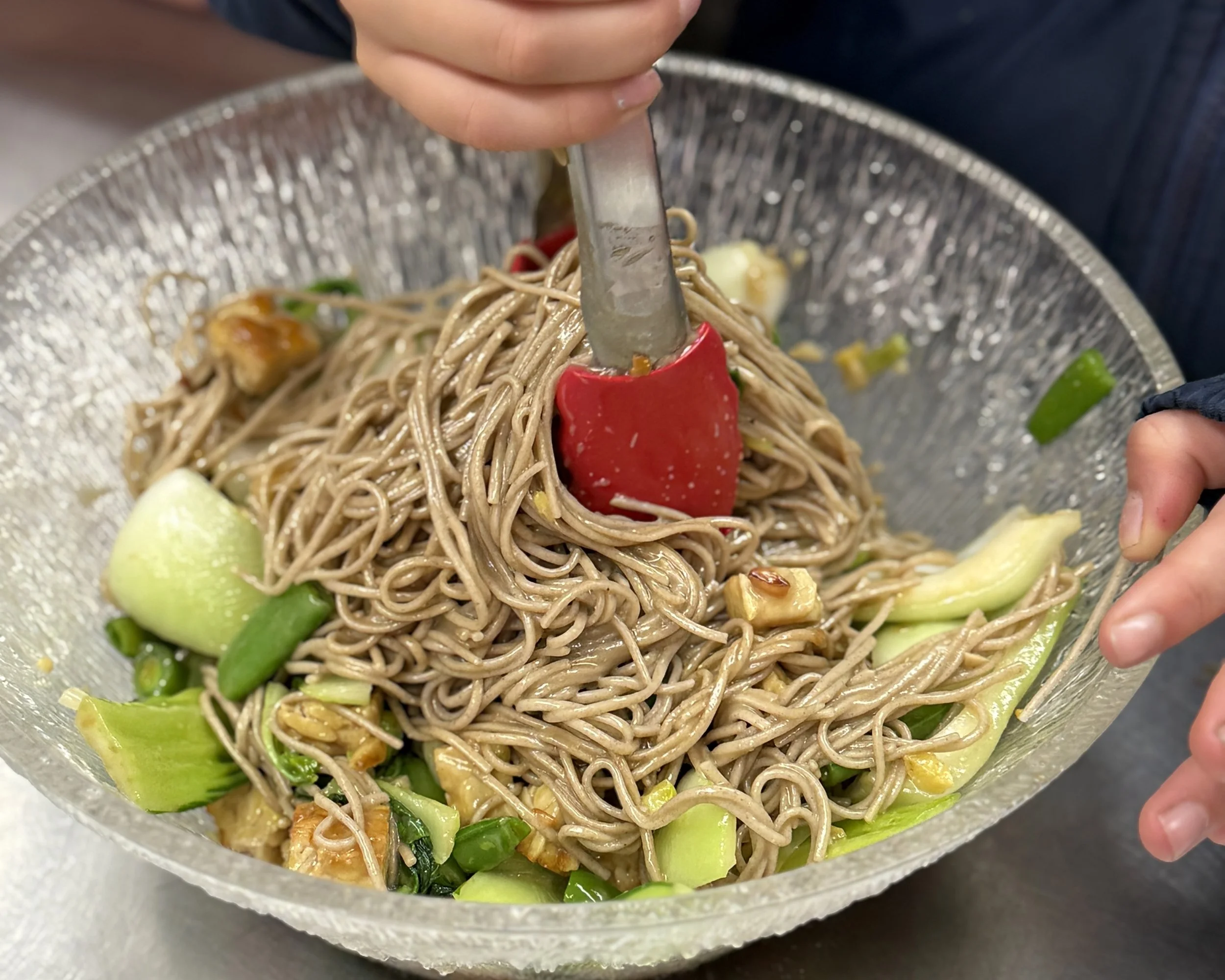 With fresh veggies and a tangy sesame & ginger dressing, this recipe can be served warm or cold as a salad. Punch it up with tofu or edamame for extra protein and you have a filling meal.